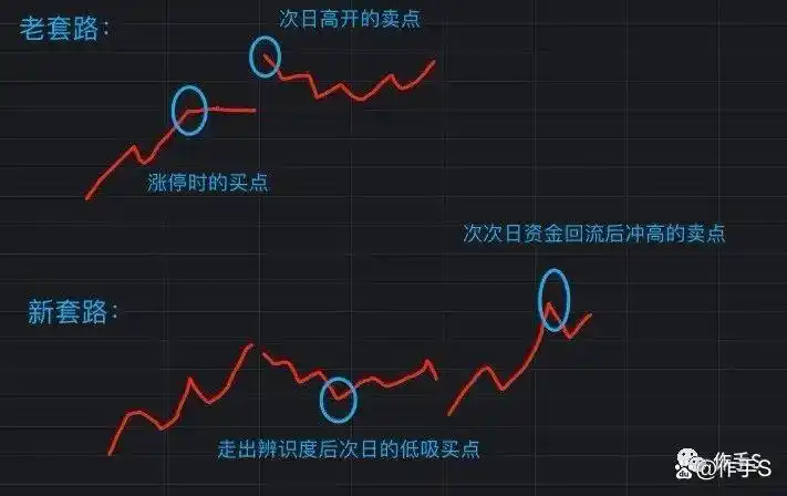 简单总结来讲就是:老套路是追高买入吃次日情绪惯性冲高的溢价,新套路是低吸买入吃次日情绪转暖后的分时溢价。
